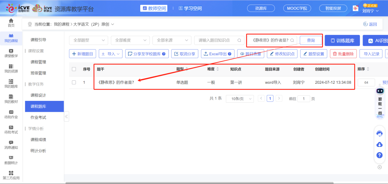 在课程题库下,针对题目中所有题目,可通过题型、难度、来源、知识点、题目题干进行筛选【查询】需要查看的题目。