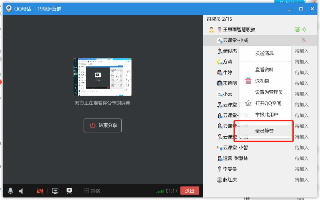 温馨提示:老师们可能会提问了,开启了屏幕分享,大家都在说话,课堂秩序还怎么维护?不用担心,需要大家认真听讲时,按照下图可开启全员静音,需要大家共同讨论时,再恢复即可。
